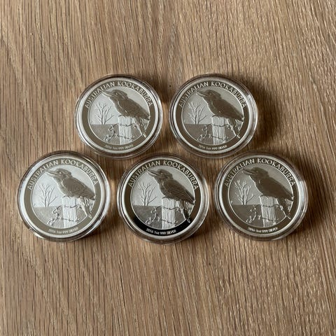 5stk av African Wildlife Elephant serien, 1oz 999 sølv i kapsler. Anm må påregnes på noen av myntene.
