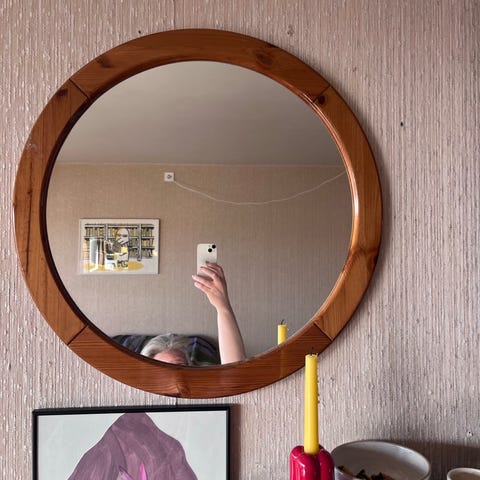 Klassisk rundt speil med brunsvart reim av skinn (mulig imitasjon) 😊 Selges grunnet at jeg ikke har noe naturlig plass til det lenger etter flytting. Er noen år gammelt, men fortsatt i fin stand!