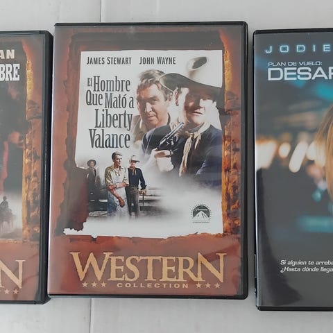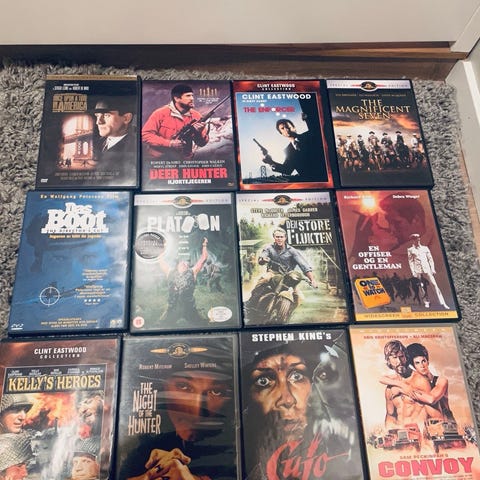 Samling med diverse DVD-filmer, hovedsakelig western og klassikere. På bildet vises flere titler med ulike omslag. Formatet er standard DVD. Egner seg for deg som ønsker en pakke med ulike filmer i samme sjanger og tidsepoke. Antall titler og eventuelle undertekster eller språk fremgår av hvert enkelt DVD-cover.