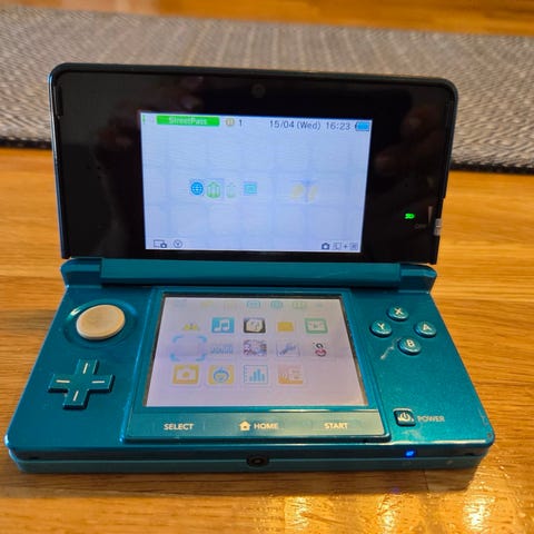 Selger en pen Nintendo 3DS i Aqua Blue. I relativ god tilstand, små bruksmerker som man kan regne med. Noe smått på top skjerm, men ikke noe som er i veien under bruk. Følger med lader, bæreveske, penn og et 2GB minnekort.