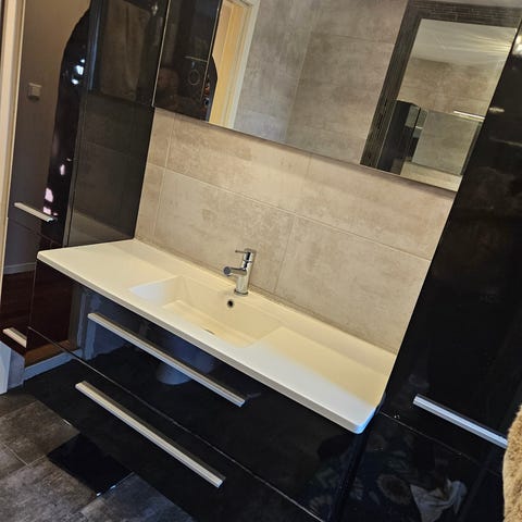 IFO Baderomsinnredning med servantskap, speilskap med stikk kontakt og lys.