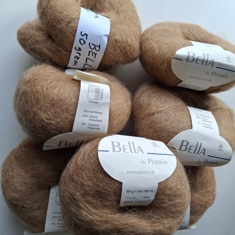 Permin Bella garn i brun farge. Garnet består av 75 % kid mohair, 20 % ull og 5 % polyamid. Nøstevekt er 50 g med en lengde på ca. 145 m per nøste. Anbefalt pinnestørrelse er 6 mm, med strikkefasthet 13 masker x 18 rader på 10 x 10 cm. Egner seg til strikke- og hekleprosjekter som gensere, jakker, sjal og andre plagg og tilbehør der man ønsker et lett og luftig uttrykk.