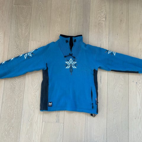 Lusekofte fra DALE AS med flotte detaljer og ull filt i blå. Fast strikk og meget god fasong