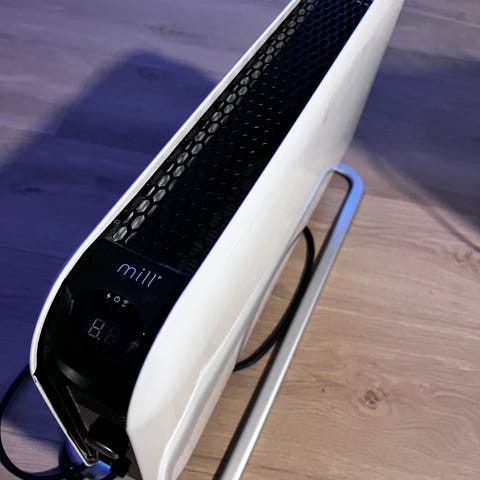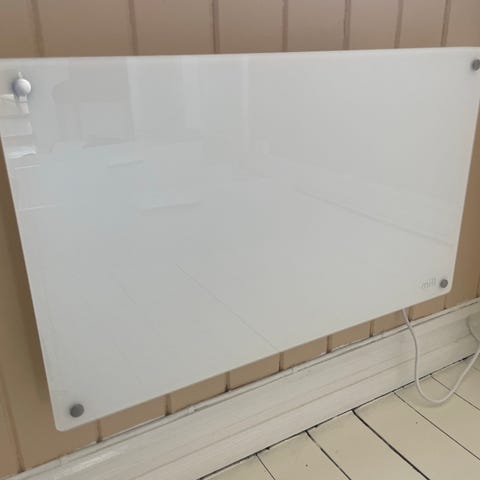 Mill gulvovn i hvit utførelse med frittstående gulvstativ. Ovnen har slank, rektangulær form med sorte sidepaneler og integrert bærestativ. Strømtilkobling med jordet støpsel. Egnet som tilleggsvarme i rom som stue, soverom eller kontor der man ønsker elektrisk punktoppvarming på gulv.