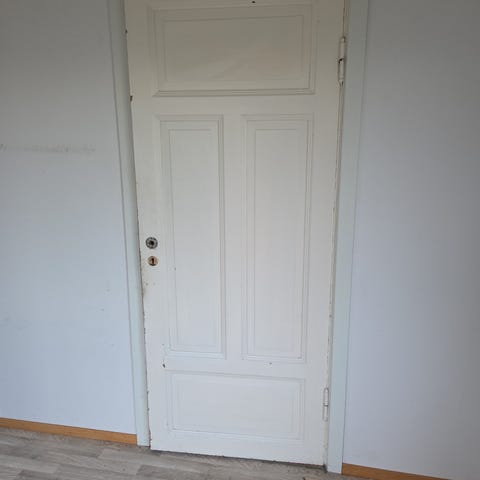 1 stk fyllingsdører i tre uten karm. Døren har klassisk profil med flere fyllinger. Overflatene er ubehandlet eller malt, med synlig slitasje og merker etter bruk. Døra stammer fra vår sveitservilla bygget i 1914. Prisantydning Kr. 1000,- eller bud over for alt.