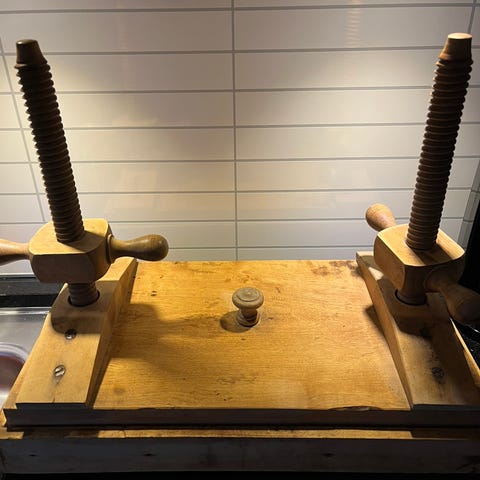 Antikk syltepresse i tre. Trolig fra slutten av 1800 tallet eller starten av 1900 tallet. HBO kr.200