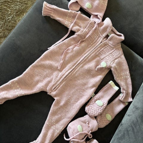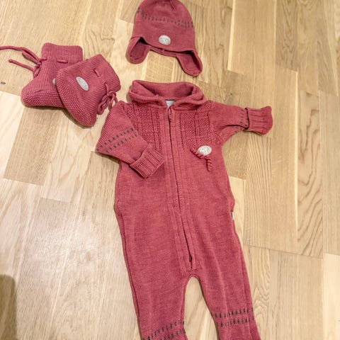 Settet inkluderer matchende lue med knyting under haken og et par votter i samme farge og mønster. Dette settet er i størrelse 62, men vi brukte den også når hun var strl 68 uten at den ble kort eller trang.