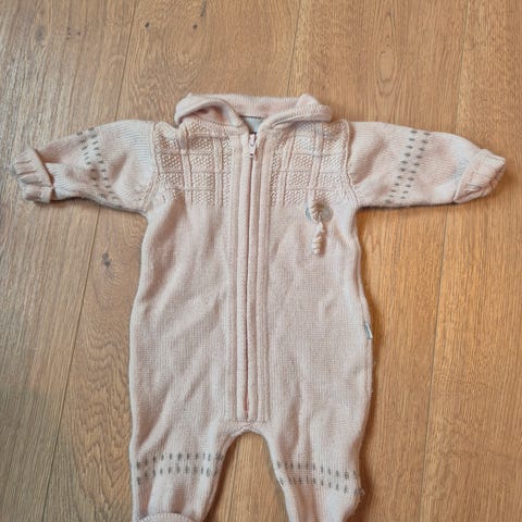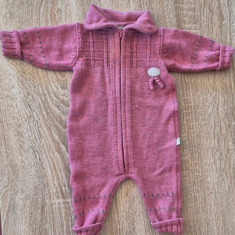 Lillelam heldress til barn i størrelse 62, unisex. Dressen er rosa og har glidelås foran for enkel av- og påkledning. Strikket strukturmønster på overdel, ermer og ben.