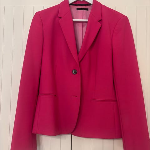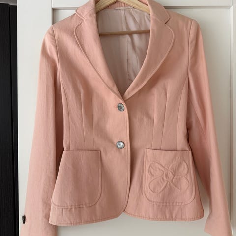 Selger «the en route suit jacket» i rosa lin fra Emmy design.