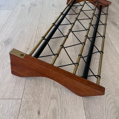 Flott retro hattehylle/garderobe hylle i teak. Ekstra lang, med 2 seksjoner og totalt 6 kroker. Hylla er i god stand, med stenger i hhv. messing og svart, og intakt, svart bånd/strikk.