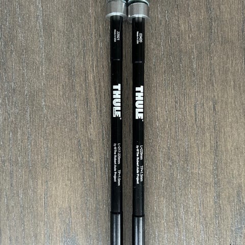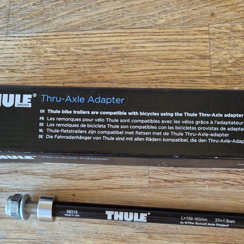 Selger thru-axle til sykkel. Passer til ulike sykler, blant annet til bruk med sykkelvogn (f.eks. Thule Chariot)