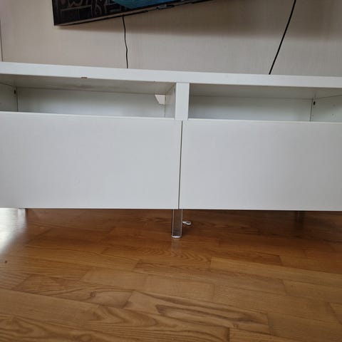 IKEA TV-benk i hvit utførelse. Møbelet har to åpne hyller på sidene som kan brukes til medieutstyr eller dekor, samt to skuffer nederst for lukket oppbevaring. I midten er det et skap med doble vitrinedører med sprosser og glass, egnet for oppbevaring av utstyr eller annet som ønskes synlig, men beskyttet. TV-benken gir god plass til TV på topplaten og har flere oppbevaringsmuligheter i samme møbel.usikker på målene som er oppgitt