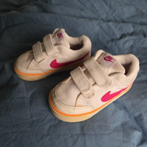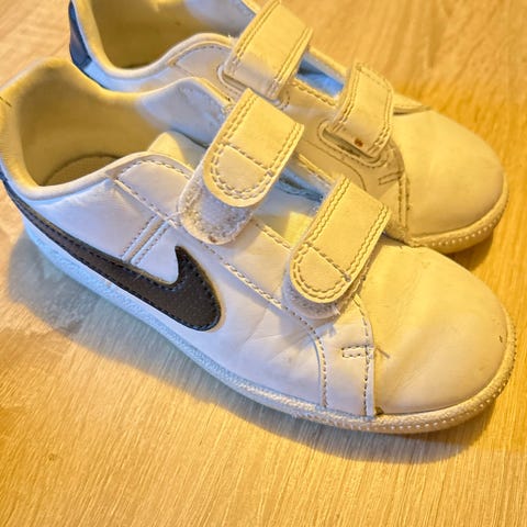 Nike joggesko for barn, jente, i størrelse 26. Skoene er hvite med rosa detaljer og har lukking med borrelås og lisser foran. Overdelen er i syntetisk materiale med polstret kant rundt ankelen for bedre komfort. Yttersålen har mønster for bedre grep. Egnet som hverdagssko og til lett aktivitet for barn i aktuell skostørrelse. 150 kr