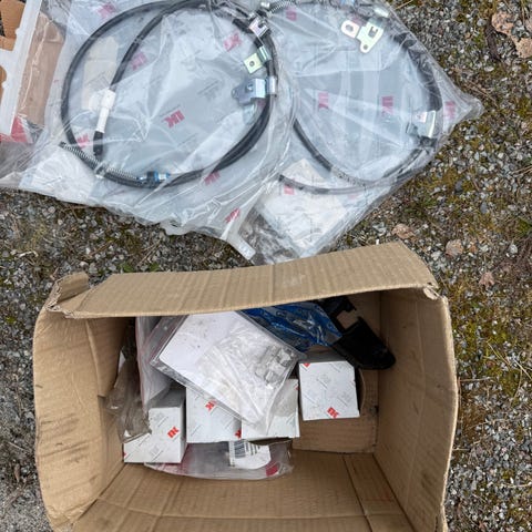 Blandingen på bildene viser ulike komponenter til Fiat, blant annet interiørdeler, ratt, støtfanger og elektriske/elektroniske enheter. Delene ligger samlet i en plastkasse samt løst ved siden av.