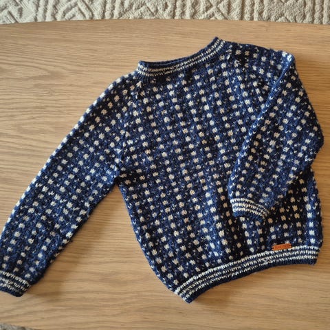 Viking ullgenser for barn i størrelse 2år. Genseren er svart med hvitt mønster i klassisk norsk stil og har høy hals med glidelås og fleece innvendig i nakken. Laget i 100% ull.