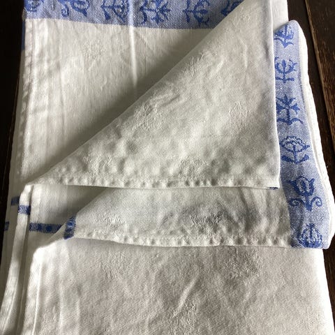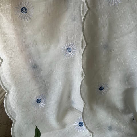 Eldre maskinsydd gardinkappe som er hvit med blått broderi. Stoffet er bomull. Designet har et gjennomgående blomstermønster i blått på lys bunn, et nostalgisk mønster, koselig som kjøkkengardin.
