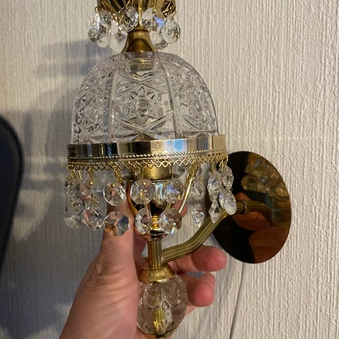 Har akkurat plukket ned to flotte vegglamper i messing utformet som lysskjold med kupler i krystall. Veldig dekorative og funksjonelle. Høyde 28 cm / bygger 16 cm ut fra vegg. Komplette. Selges samlet.