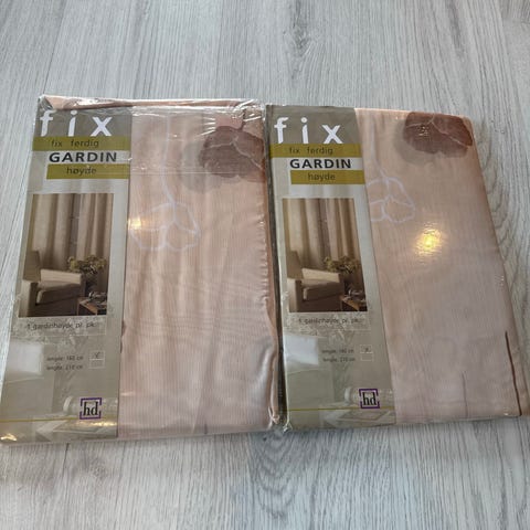 Prisen er for begge samlet. Fargen er lys beige. Laget av polyester. Den ene lengden er bare tatt ut av pakken, men ikke vært brukt. Ikke lystette. 220 x140 cm. Gardinen har multibånd øverst som gjør at de kan henges på ulike typer gardinstenger.
