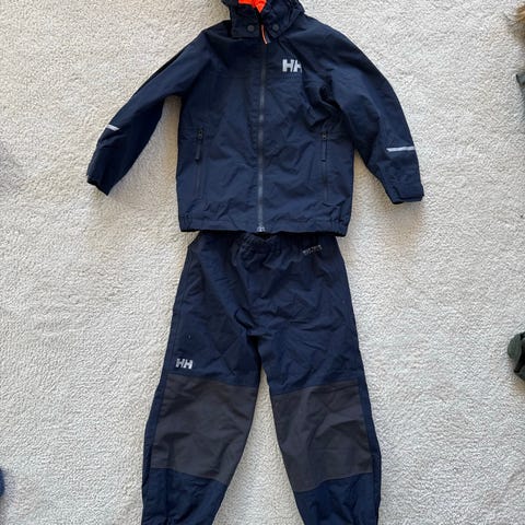 Helly Hansen vind og vannavvisende tøy. Brukt til 1 barn. Buksa er 104 og jakke er 110. De er brukt samtidig. Dette settet betalte jeg 1300 kr for på XXL. Selges 350