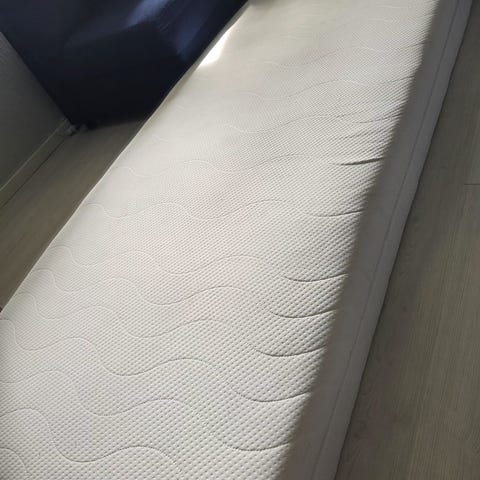 Hvit madrass med vattert overflate og bølgeformet/stripet quilting. Standard rektangulær form, egnet til bruk i seng eller gjesteseng. Passer til soverom eller gjesterom, og kan brukes alene eller som del av en dobbel løsning med to madrasser ved siden av hverandre.