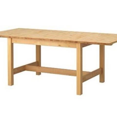 Solid og stødig familiebord med praktisk ileggsplate lagret under bordplaten. Bordet har god plass til ca. 8–12 personer.