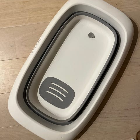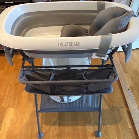 Twistshake babybadekar sammenleggbart i grå og hvit plast. Badekaret har støtteben og kan foldes flat for enkel oppbevaring. Medfølgende grå badepute gir ekstra støtte og komfort til baby under bading. Egnet for bruk på gulv eller i dusj, og passer til små barn og spedbarn under tilsyn av voksen.