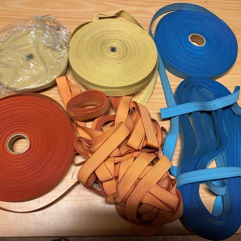 Pakke med ulike bånd selges. Inneholder blant annet dekorbånd med pote-mønster i flere farger, stripet bånd i polyester, ensfarget mørkeblå webbing og grønt bånd fra Søstrene Grene (1 cm x 3 m, 100 % bomull). Egnet til hobbyprosjekter, søm, dekorasjon og lignende.