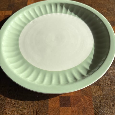 4 eldre Egersund middagstallerkener i hvitt porselen med rillet kant og enkel dekor. 23,5 cm i diameter. 2 av tallerkene har produksjonsfeil, se bildene. Selges samlet for kr 300 + porto.