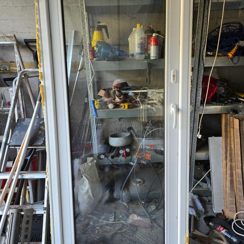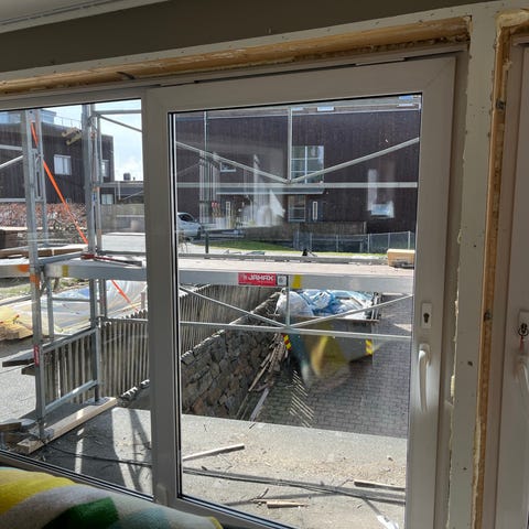 Nordan dørhåndtak/vrider i sølvfarget aluminium til terrassedøren.
