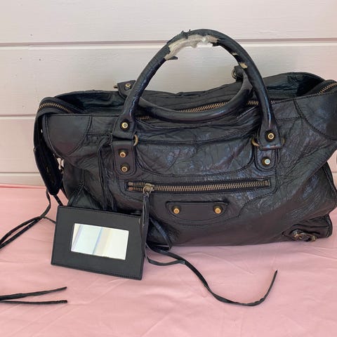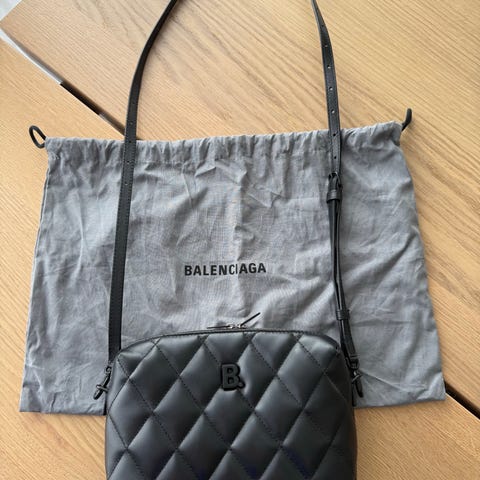 Balenciaga skulderveske i lær for dame. Vesken er laget i mykt skinn i en grå fargetone og har justerbar skulderreim. Hovedrommet lukkes med glidelås, og på forsiden er det en ekstra glidelåslomme for mindre eiendeler. Innvendig har vesken fôret interiør med en mindre lomme og Balenciaga-merkelapp. Det følger med støvpose og tilhørende merkelapper som vist på bildene.