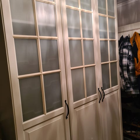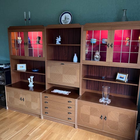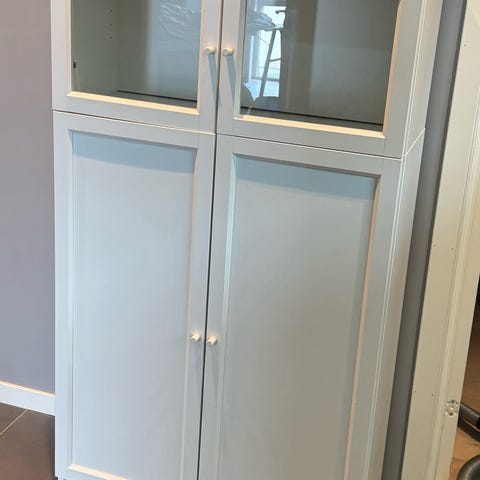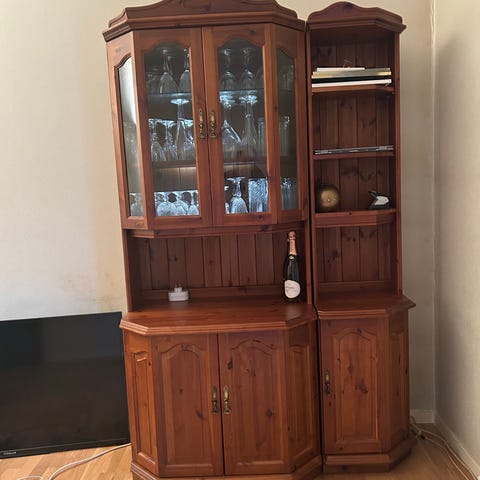 2 stk Bodbyn vitrineskap,138 h x 42 bred, står på benk med 2 skuffer gis bort mot demontering