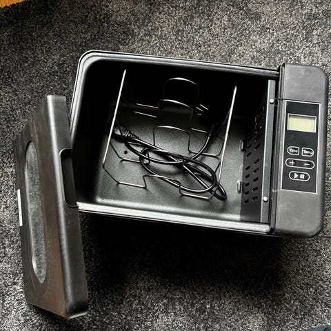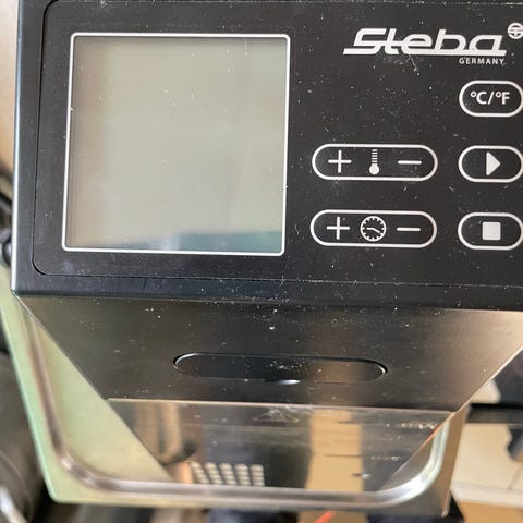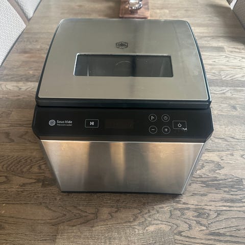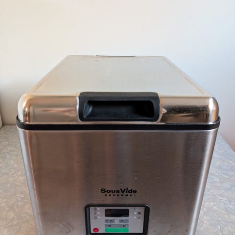 SousVide Supreme vannbad sous vide-maskin i svart utførelse. Enheten har digitalt kontrollpanel på forsiden for innstilling av temperatur og tid. Innsiden består av vannbad med uttakbar perforert bunnplate og stativ for posisjonering av vakuumposer. Egnet til sous vide-tilberedning av kjøtt, fisk, grønnsaker og andre råvarer hjemme på kjøkkenet.