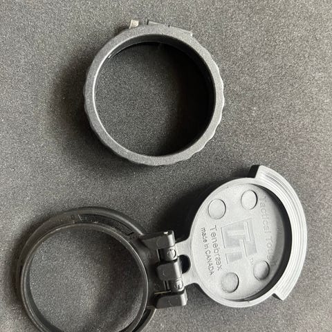 Tenebræx UA0001-FCR flipplokk med adapter i svart. Flipplokket er laget for å monteres foran optikk og gir beskyttelse til linsen når det ikke er i bruk. Lokk og adapter er i svart utførelse og festes rundt røret på kikkerten eller tilsvarende optisk enhet. Lokket kan vippes opp ved bruk og lukkes igjen for å skjerme mot støv og riper. Passer til de fleste modeller.