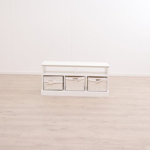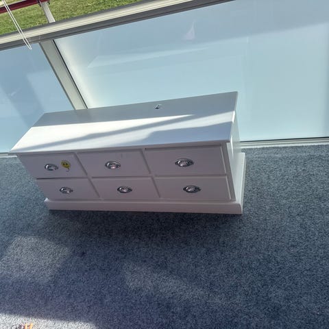 TV-benk: med to romslige skuffer. Synlig bruksmerke på høyre side hvor sideplaten har løsnet så vidt. Kan nok limes. H: 48, B: 39,5, L: 120 cm