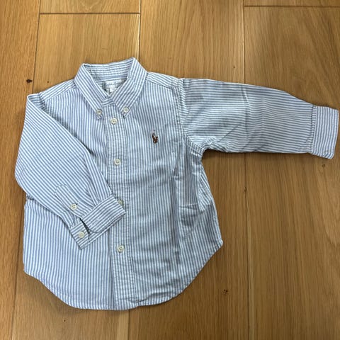 Fin brukt et par ganger pent skjort av Ralpf Lauren. 18 måneder i str. Mørt blå farge med fargerike stripper.
