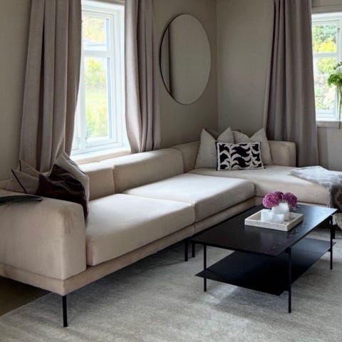 Fra det danske merke Topline, modell Malmø. Fargen er beige og stoffet har en vevd struktur. Kan minne om lin, men mye mere slitesterkt😍