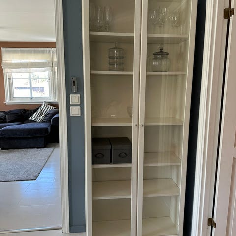 Vitrineskapet har to glassdører i front med sprosser og flere innvendige glasshyller som gir god oversikt over innholdet. Skapet står på sokkel og har skuffer nederst for ekstra oppbevaring. Egner seg til oppbevaring og utstilling av servise, glass og pyntegjenstander.