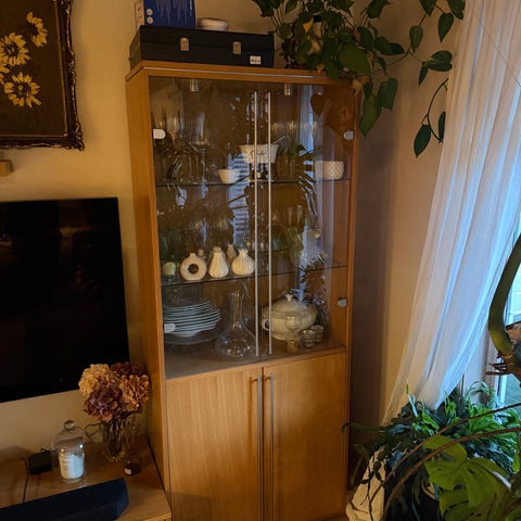 Skeidar vitrineskap og skjenk i lyst treverk med glassdører.