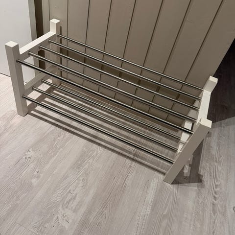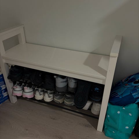 Mål ca. 85 x 64 x 32 cm (bredde x høyde x dybde). Passer i gang, entré eller garderobe for organisering av fottøy og som sitteplass ved på- og avkledning av sko.