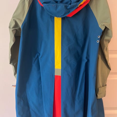 Grønn lang kåpe, vann/vindtett og pustende materialet. Deilig og varm, men lite brukt, da den er litt stor for meg.