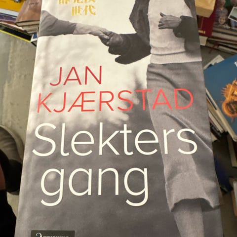 Jan Kjærstad Slektens gang bok. Innbundet skjønnlitterær bok med omslagsbilde i sort-hvitt. Tekst på norsk. Passer for lesere som er interessert i moderne norsk litteratur.