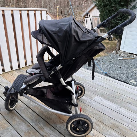 Eldre Britax duo barnevogn i svart tekstil. Vognen har justerbart håndtak og hette som skjermer barnet. På sittedelen har setet seler for sikker fastspenning. Medfølger liggedel. Understellet har fire hjul og varekurv under setet. Vognen kan legges sammen for enklere oppbevaring og transport. Passer til én baby eller ett barn og er godt brukt og av eldre versjon. Slitasje etc forekommer, bakhjulene er i orden da det er skiftet slange på begge 2 nylig. Alle hjul er nå fine og gode i bruk. Den er kjøpt brukt og blitt brukt i barnehage som sovevogn og funket ypperlig for det.
