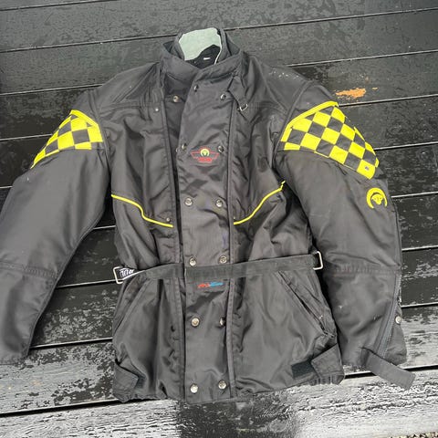 Tekstiljakke fra Yoko sports med en del forsterkninger, mye lommer og detaljer. Avtagbart innerfor for de varmeste dagene. Behagelig og lett. En liten åpning i den ene aksillen (kan lett syes, skyldes ikke fall), se bilde med hånd), selges derfor rimelig. Størrelse L (ca 180 cm)