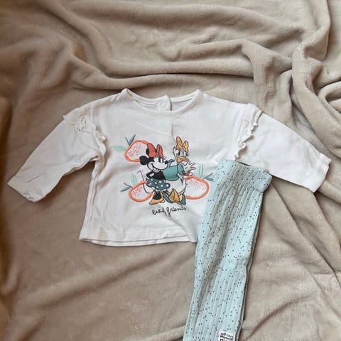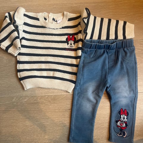 Disney Minnie Mouse sett med genser og tights for jente i størrelse 74. Overdelen er en beige genser med Minnie Mouse-motiv og påsydd tyllskjørt. Underdelen er en brun tights med små Minnie-detaljer. Passer som hverdagsantrekk eller til enklere pyntede anledninger for små barn i størrelse 74/80