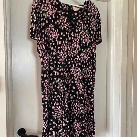 Ze-ze hverdagskjole for dame i størrelse M. Kjolen er laget i viskose og har flerfarget blomstermønster på mørk bunn. Den har kort erm og v-utringning med lett rynkedetalj foran. Passer som en enkel hverdagskjole i lett og mykt materiale.