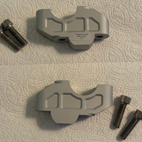 KEMIMOTO styrehever 32 mm for BMW R1200GS, R1250GS, LC, S1000XR, R1250RT og R1200GS Adventure. CNC-freste aluminiumsdeler i sølvfarge. Settet inneholder styrehevere og tilhørende bolter/skruer som vist på bildet. Beregnet for å heve styret 32 mm for bedre tilpasning av kjørestilling på aktuelle BMW-modeller.