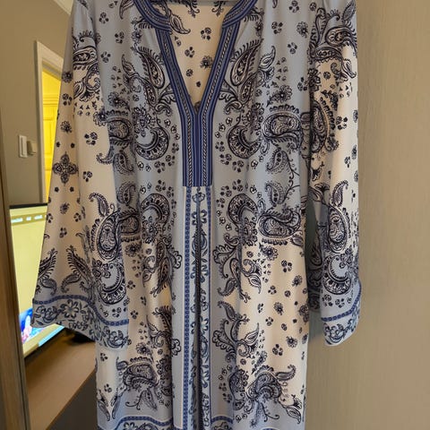 H&M L.O.G.G. bluse for dame i størrelse M. Blusen er hvit med blått, ornamentert mønster foran, bak og på ermene. Den har 3/4-lange ermer og V-utringning med knappestolpe. Lengden går ned over hoftene, og modellen kan brukes både som tunika og bluse. Stoffet er lett og semitransparent, egnet til hverdagsbruk eller over badetøy på varme dager.