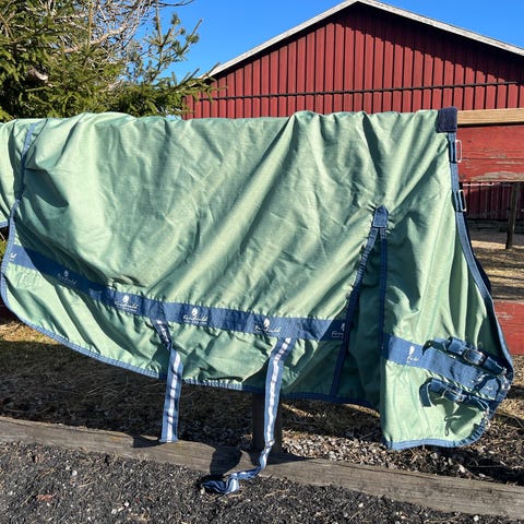 Utedekken i slitesterk 600D polyester, vanntett og pustende 3000/3000, som bidrar til å holde hesten din tørr i skikkelig røft vær. Blankt innerfôr i 210D polyester som ikke trekker til seg smuss og støv og bidrar til å forhindre gnagsår. Fôret med 200 gram. Det følger med hals som er ikke brukt.