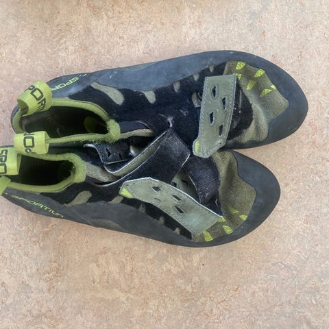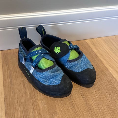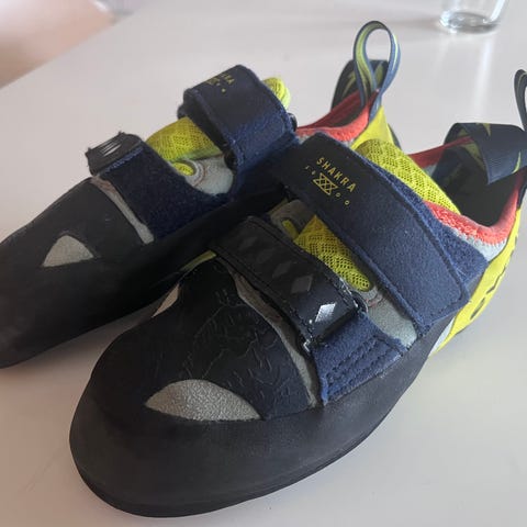 Selger et par klatresko. Skoene er brukt, men fortsatt i god stand og fullt brukbare til klatring og trening.
