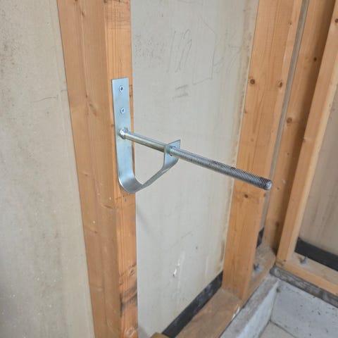 4 stk dekkhengere for veggmontering. Gjenget, galvanisert stålstang på festeplate som skrus opp på veggen. Hengerne kan belastes med inntil 20 kg hver. Lengde: 230 mm.